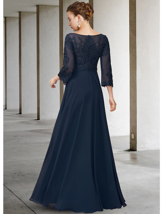 A-Line Mother of the Bride Dress Elegant V Neck Floor Length Chiffon Lace 3/4 Length Sleeve with Appliques
