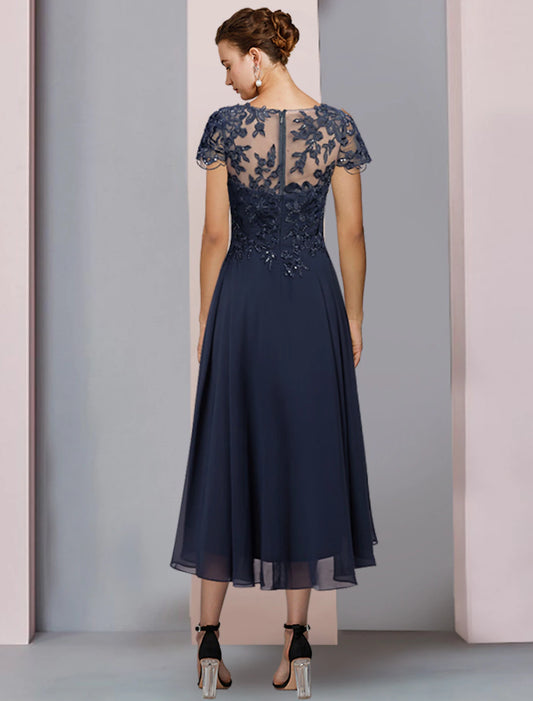 A-Line Mother of the Bride Dress Formal Wedding Guest Elegant Scoop Neck Jewel Neck Tea Length Chiffon Lace Short Sleeve with Pleats Sequin Appliques