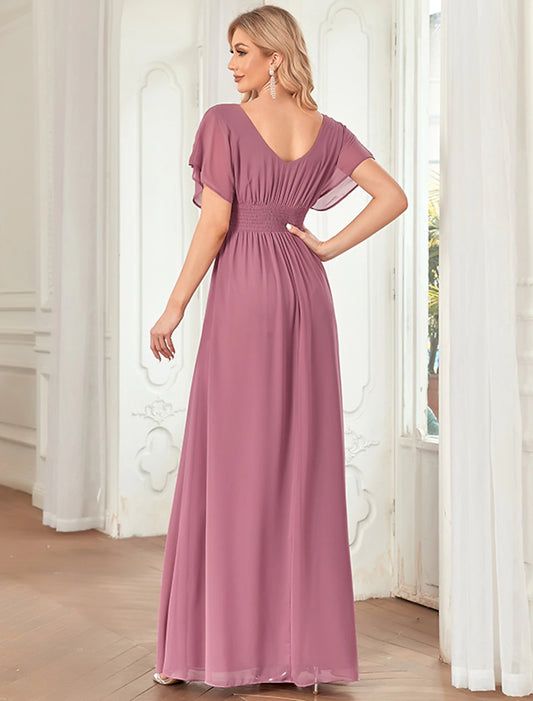 A-Line Elegant Formal Evening Dress V Neck Short Sleeve Floor Length Chiffon with Draping