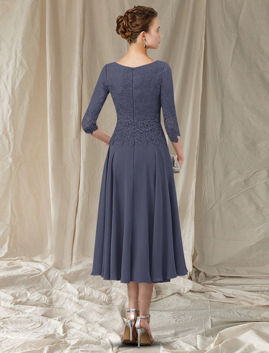 A-Line Mother of the Bride Dress Elegant Jewel Neck Tea Length Chiffon Lace 3/4 Length Sleeve with Pleats Appliques
