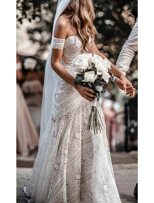 Beach Sexy Boho Wedding Dresses Mermaid / Trumpet Sweetheart Short Sleeve Court Train Lace Bridal Gowns With Lace