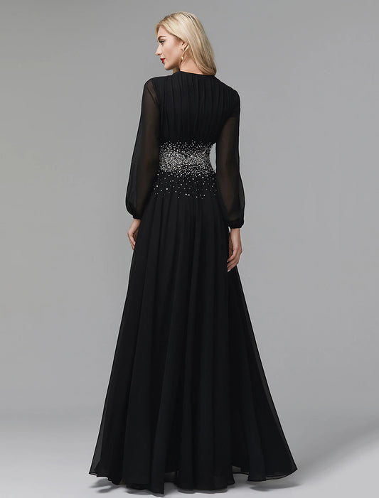 A-Line Evening Dress Celebrity Red Carpet Formal Gown Party Dress Black Tie Wedding Guest Floor Length Long Sleeve V Neck Chiffon with Sequin