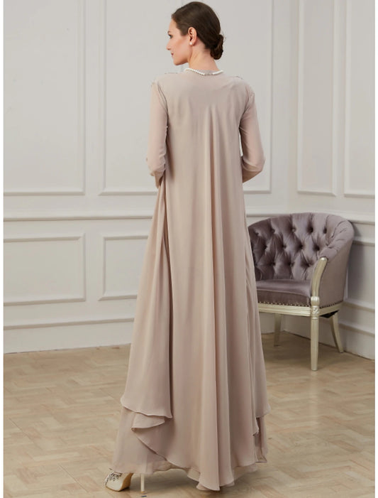 A-Line Mother of the Bride Dress Wedding Guest Elegant Jewel Neck Floor Length Chiffon Long Sleeve Jacket Dresses with Appliques Fall