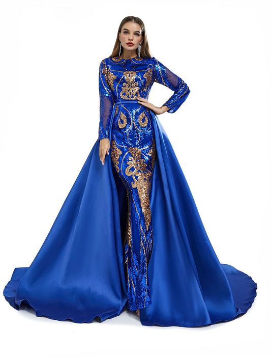 Mermaid / Trumpet Evening Gown Sparkle & Shine Dress Formal Wedding Floor Length Long Sleeve V Neck Detachable Polyester with Sequin Overskirt