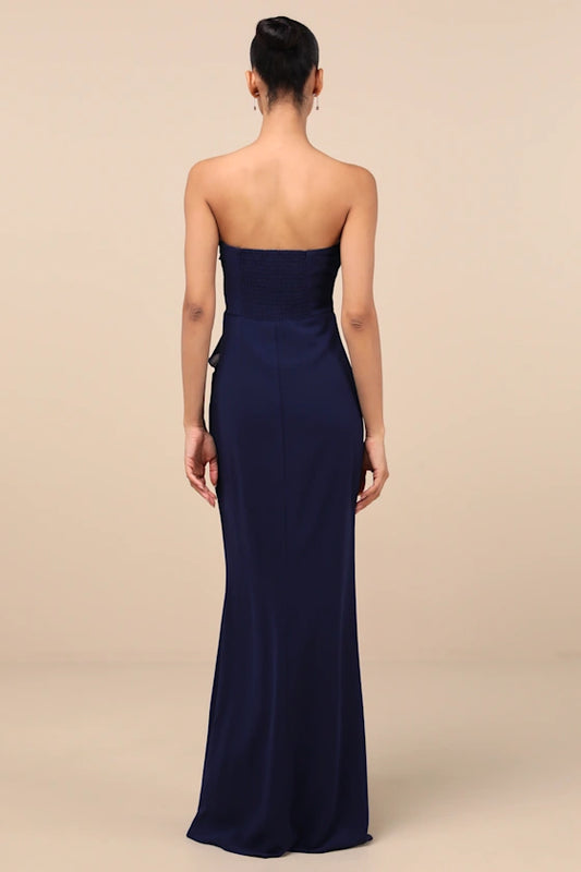 Gorgeous for women Navy Blue Strapless Ruffled Bodice Smocked Back Fitted Floor-Length Prom Dress