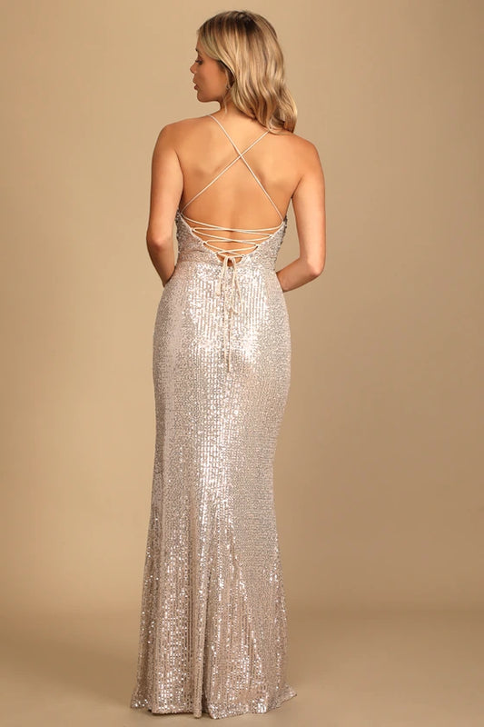 Gorgeous for women Sequin Spaghetti Strap Square Neck Cross Lace-Up Back High Slit Fitted Floor-Length Prom Dress