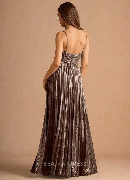 Elegant A-Line Spaghetti Strap Pleated Maxi Dress with Side Slit Prom Dress