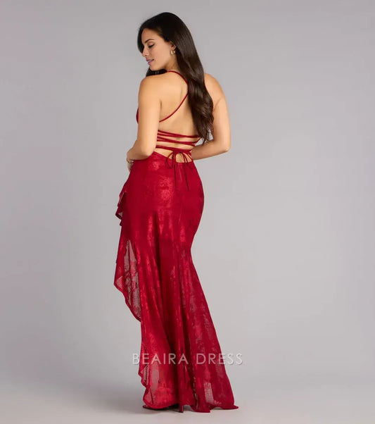 Gorgeous for women Spaghetti Strap Crisscross Back Ruffled High-Low Maxi Dress Prom Dress