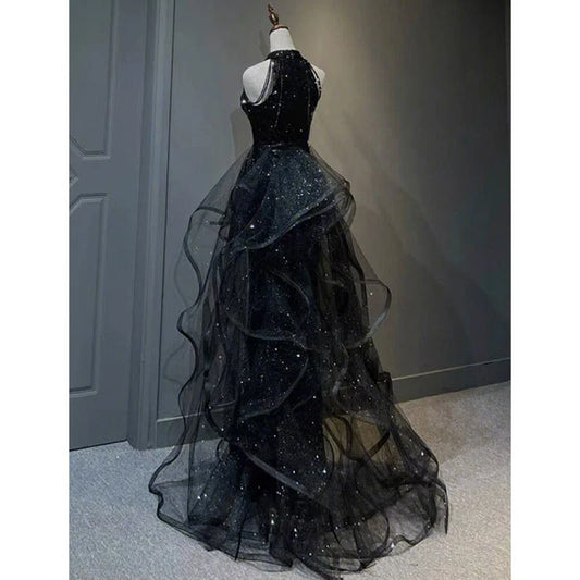 Beaira High Neckline Black Halter Shiny Tulle And Sequins Party Dress Black Tulle Prom Dress prom dresses shops