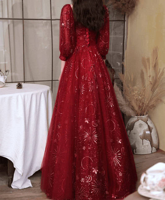 Beaira Wine Red Tulle with Lace Puffy Sleeves Prom Dress A-line Wine Red Bridesmaid Dress prom dresses shops