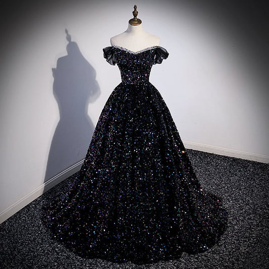 Beaira Black Off Shoulder Shiny Beaded Long Prom Dress A-line Black Evening Dress prom dresses shops