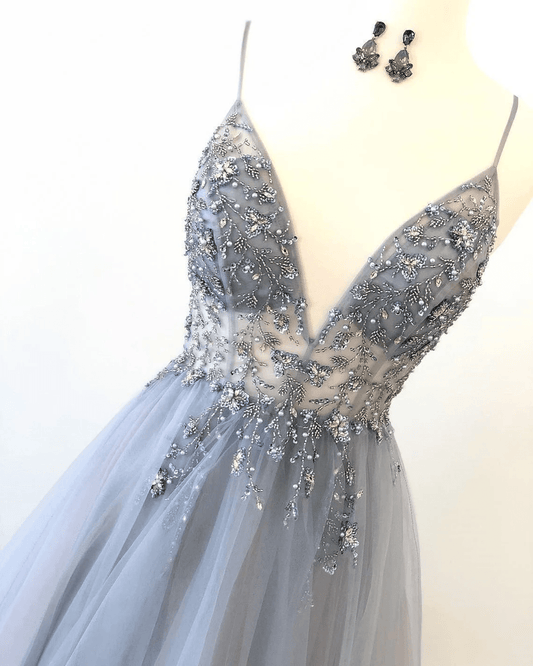 Beaira Tulle V-neckline Straps Beaded Low Back Long Formal Dress Tulle Prom Dress prom dresses shops
