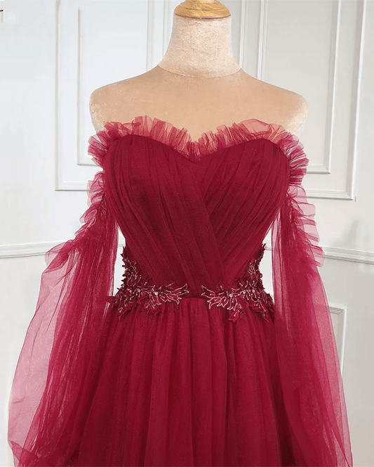 Beaira Wine Red Long Sleeves Beaded Tulle Evening Gown A-line Wine Red Long Prom Dress prom dresses shops