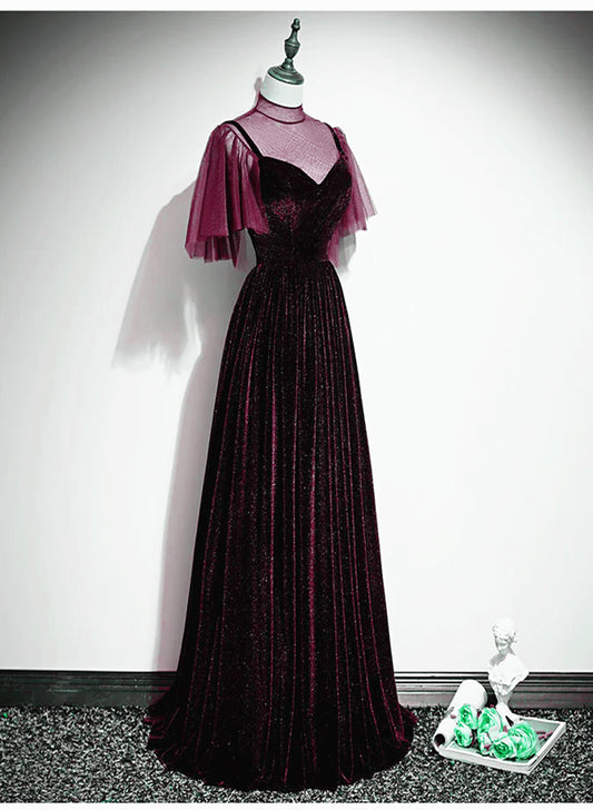 Beaira Burgundy Velvet A-Line Long High Neckline Party Dress Burgundy Long Bridesmaid Dress prom dresses shops