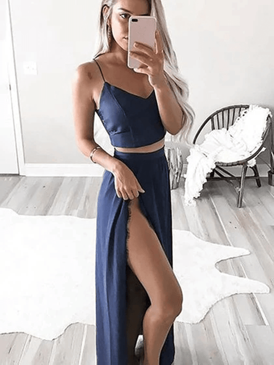 Beaira Dark Blule ChiffonTwo Piece Prom Dress V-neck A-line Lace Long Slit Sexy Party Dress prom dress shop