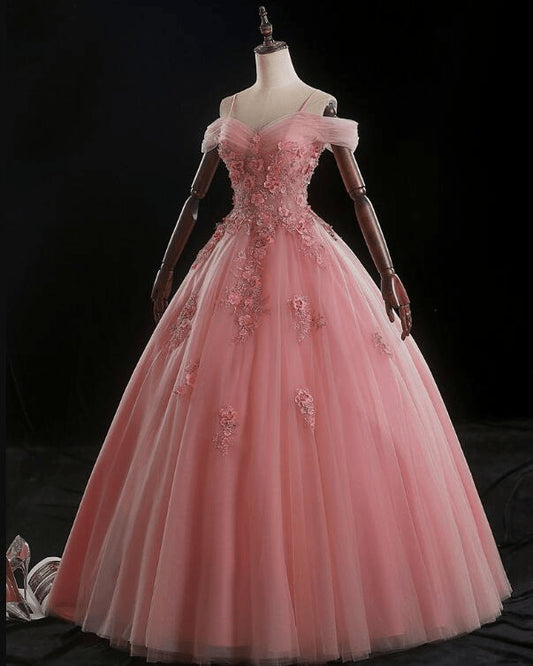 Beaira Off Shoulder Pink Sweetheart Tulle with Lace Party Dress Pink Sweet 16 Dress prom dress shop