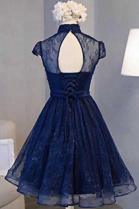Beaira Navy Blue Lace Short Sleeve Knee-Length Homecoming Dress Navy Blue Prom Dress prom dress shop