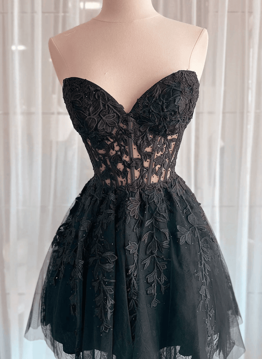 Beaira Black Tulle with Lace Sweetheart Homecoming Dress Black Short Prom Dress prom dresses with long sleeves
