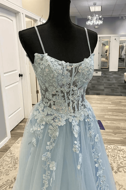 Beaira Light Blue A-line Tulle with Lace Applique Prom Dress Blue Formal Dress prom dresses stores