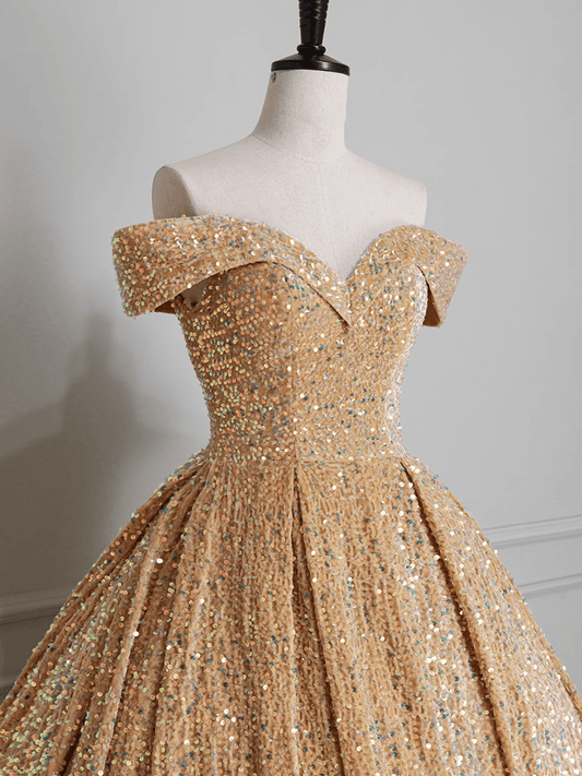 Beaira Off Shoulder Gold Ball Gown Tulle with Lace Applique Prom Dress Gold Sweet 16 Dress long sleeve long dresses prom