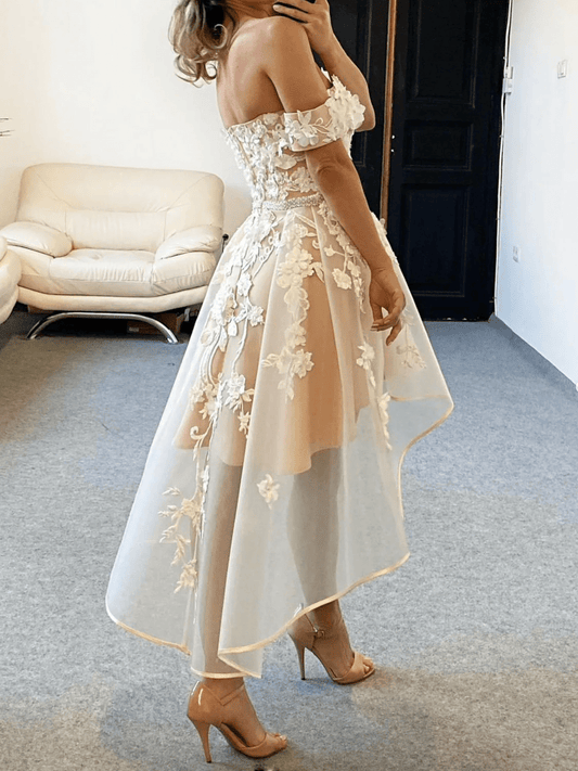 Beaira Light Champagne High Low Tulle Party Dress High Low Lace Applique Homecoming Dress prom dresses stores