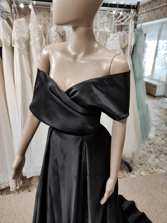 Beaira Black Satin Off Shoulder Long Formal Dress A-line Black Wedding Party Dress