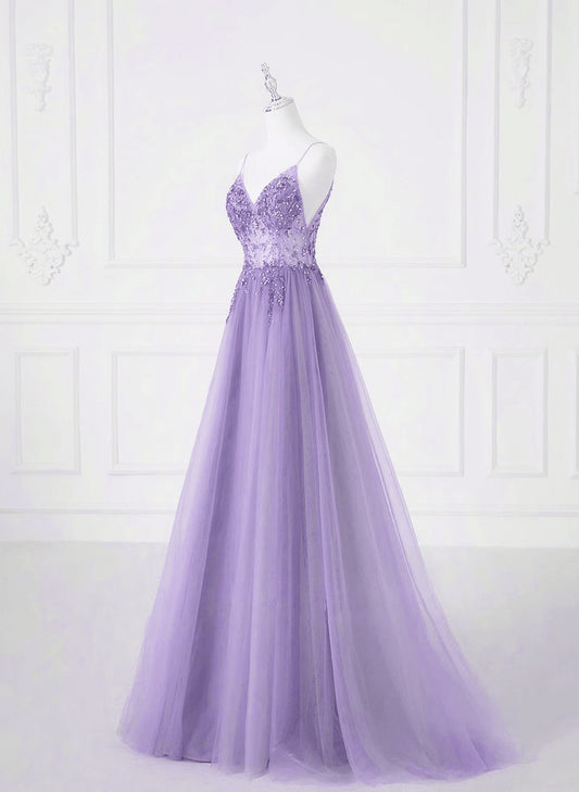 Beaira A-line Tulle Lavender Beaded Long Prom Dress Lavender Tulle Formal Dress prom dresses with long sleeves