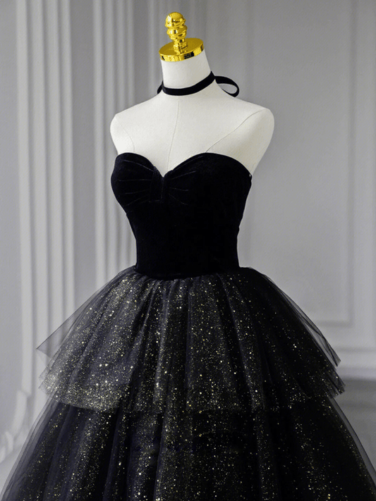 Beaira Black Sweetheart Neck Tulle Sequins Layers Long Prom Dress Black Formal Dress long prom dresses with sleeves