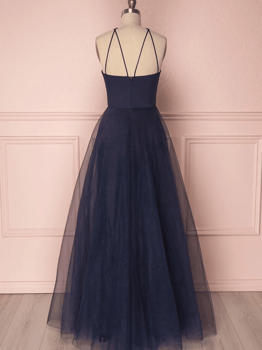 Beaira A-line Tulle Navy Blue Long Straps Prom Dress Navy Blue Tulle Long Evening Dress long prom dresses with sleeves