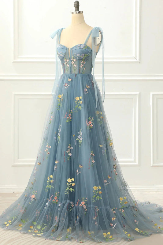 Beaira A-Line Blue-Grey Princess Prom Dress With Embroidery Floral Lace Party Dress