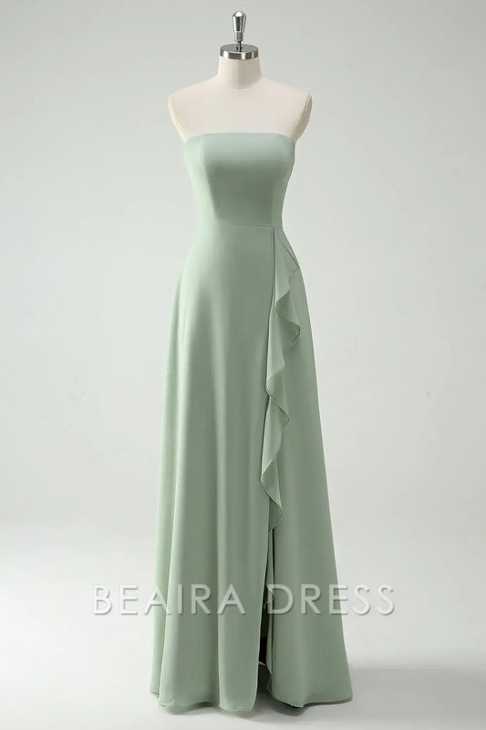 Beaira Elegant Dusty Sage A Line Strapless Chiffon Long Bridesmaid Dress with Ruffle Slit