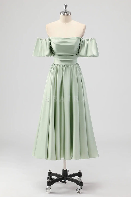 Beaira Elegant Sage Green A Line Off The Shoulder Ruched Tea-Length Satin Bridesmaid Dress