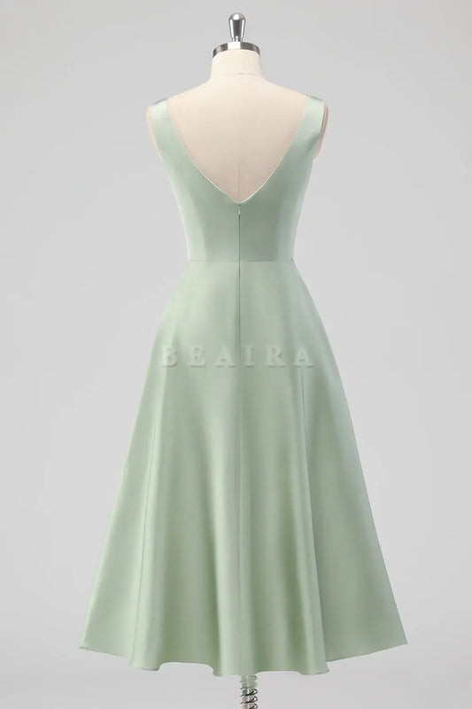 Beaira Elegant Sage Green A Line Square Neck Tea-Length Satin Bridesmaid Dress