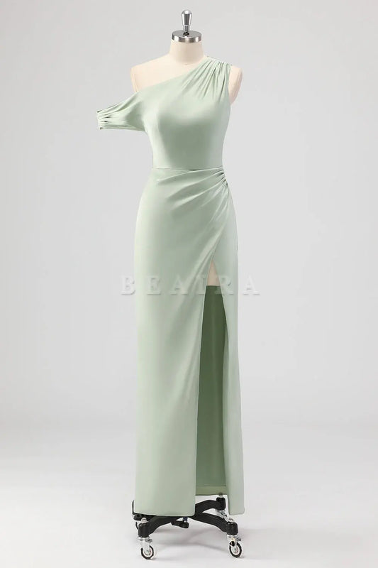Beaira Simple Sage Green Sheath One Shoulder Satin Ruched Long Bridesmaid Dress with Slit New Arrivals
