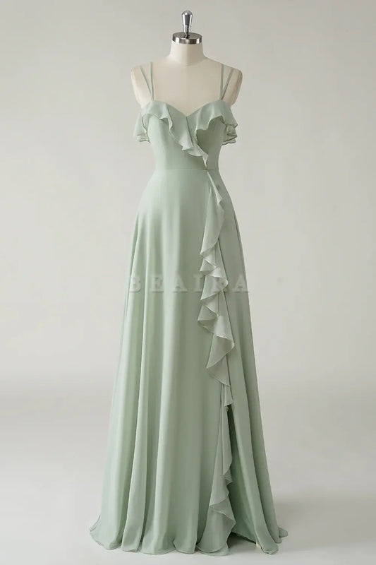 Beaira Elegant Dusty Sage A Line Spaghetti Straps Chiffon Long Bridesmaid Dress with Ruffle Slit