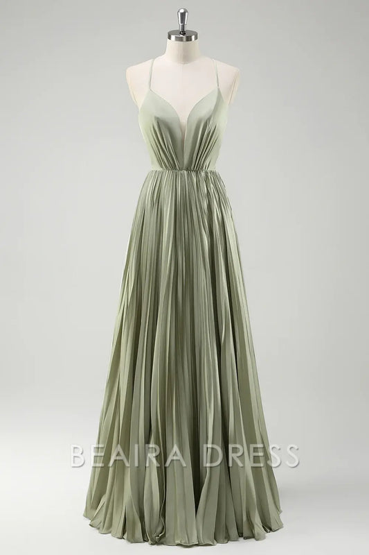 Beaira Elegant Grey Green A-Line Spaghetti Straps Pleated Long Bridesmaid Dress With Lace Up Back