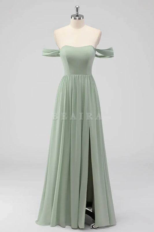 Beaira Elegant Sage Green A-Line Off The Shoulder Ruched Chiffon Long Bridesmaid Dress with Slit