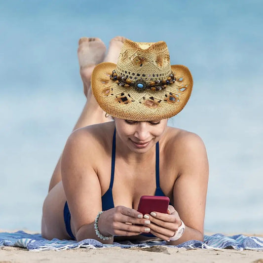 Beaira Straw Cowgirl Hat Unisex Beach Hat Cow Boy Hat With Hat Band For Men Women Breathable Lightweight Sun Protection