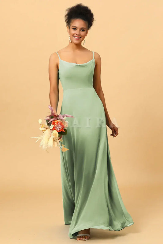 Beaira Elegant Sage Green A Line Spaghetti Straps Pleated Satin Long Bridesmaid Dress