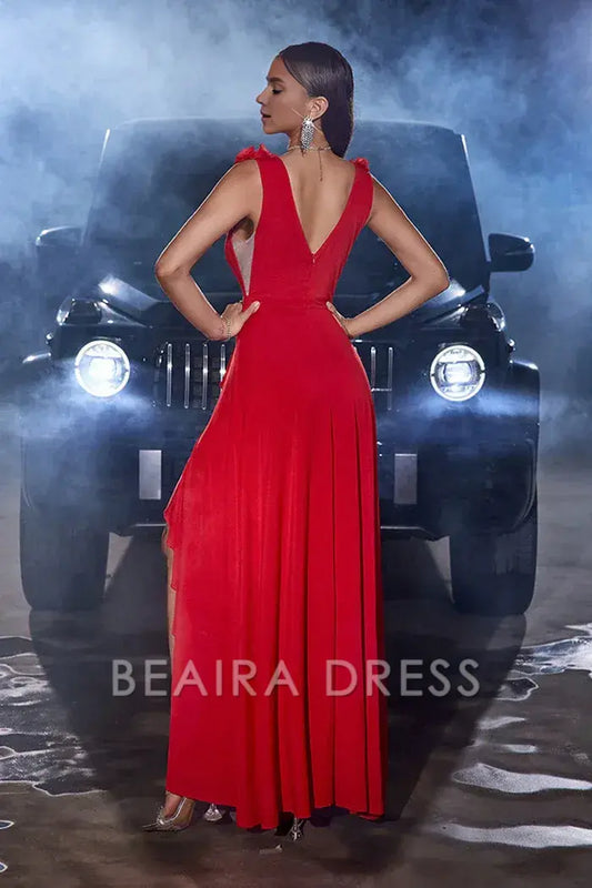 Beaira Elegant Red A Line V Neck Long Dress with Slit - Red
