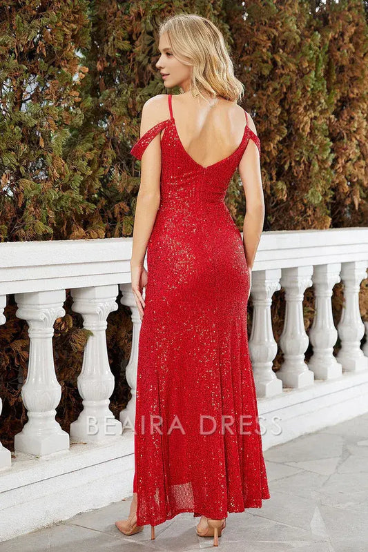 Beaira Elegant Sparkly Red Sequined Cold Shoulder Evening Party Dress With Slit - Red
