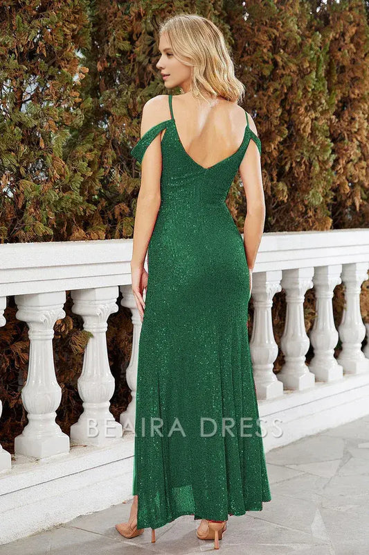 Beaira Elegant Sparkly Green Sequined Cold Shoulder Evening Party Dress With Slit - Green