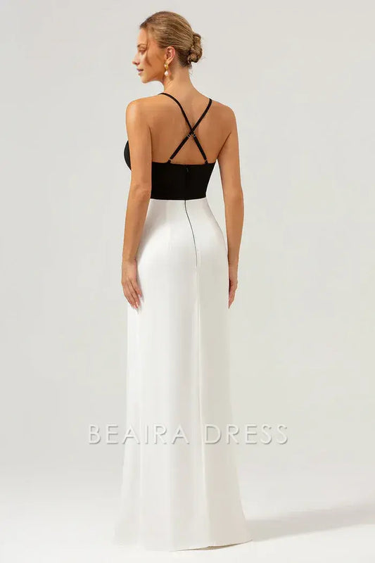 Beaira Elegance Black White Sheath Spaghetti Straps Long Prom Dress With Front Split - Black+White