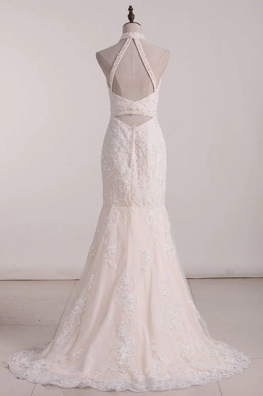 Tulle Party Dresses Mermaid Halter With Applique Open Back