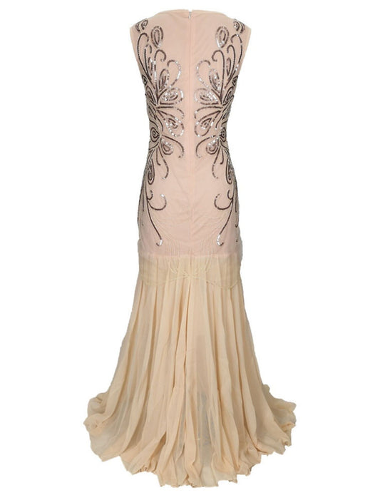 A-Line Evening Gown Vintage Dress Holiday Party Wear Floor Length Sleeveless Jewel Neck Cotton Blend with Sequin Splicing