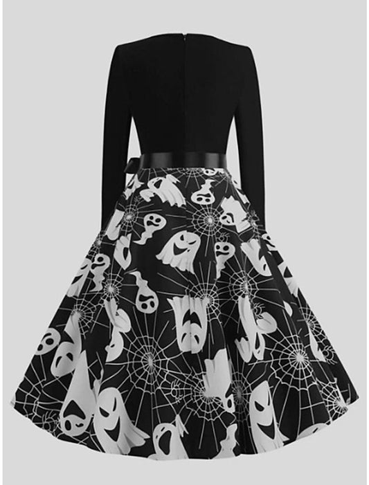 A-Line Party Dresses Vintage Dress Halloween Knee Length Long Sleeve Jewel Neck Polyester with Bow(s) Print