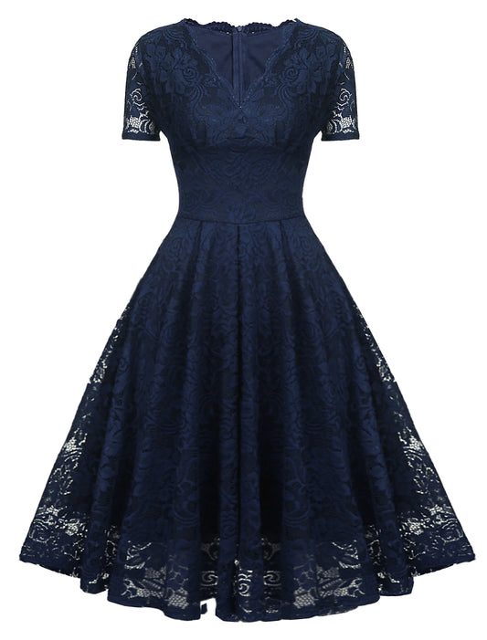 A-Line Cocktail Dresses Vintage Dress Party Wear Cocktail Party Knee Length Half Sleeve Jewel Neck Fall Wedding Guest Lace with Pleats