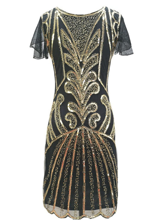 Sheath / Column Party Black Dress Vintage Dress Halloween Wedding Guest Tea Length Short Sleeve Jewel Neck Nylon with Fringe Tassel Embroidery