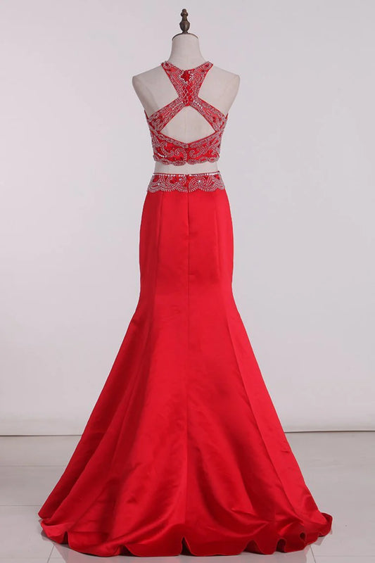 Two-Piece Scoop Party Dresses Mermaid Satin With Beading