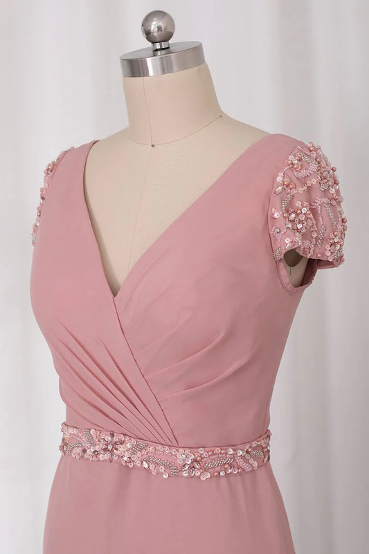 V Neck Short Sleeves Party Dresses Chiffon With Beading